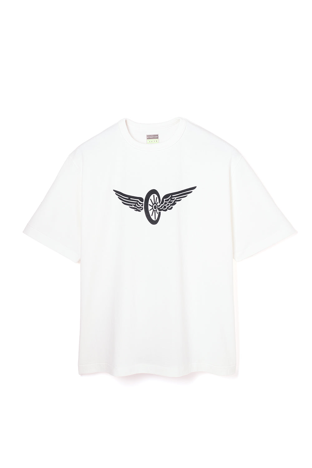 A fictional motorcycle club design by MASA SCULP, featuring a flying wheel print on the front and typography on the back.